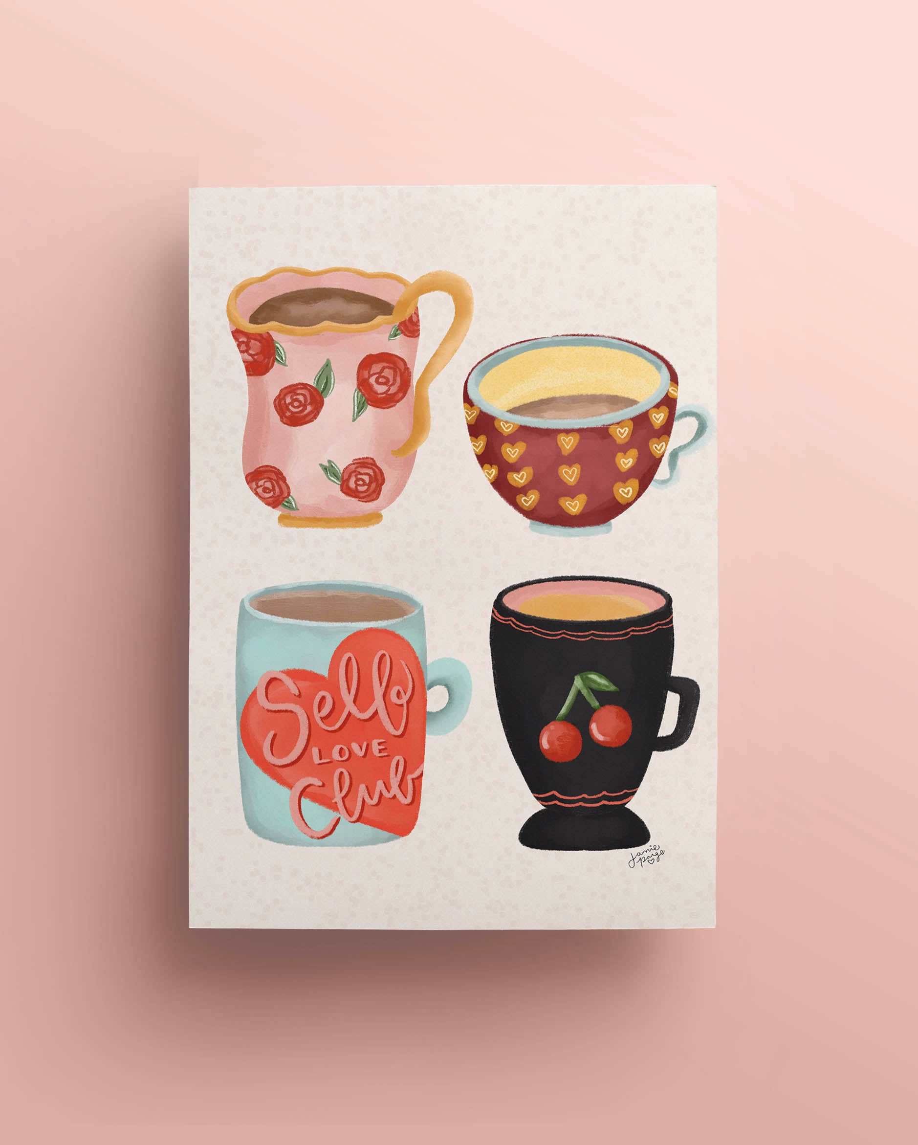 4 cute little mugs! (Background is a soft cream with a faint grainy texture).